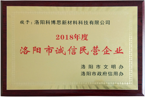近日,由市文明辦與市政府信用辦舉辦的《洛陽市2018年度“誠信經營企業”和“誠信建設先進個人”評選活動》,經推薦遴選和嚴格評審,洛陽科博思新材料科技有限公司被授予“誠信民營企業”榮譽稱號。